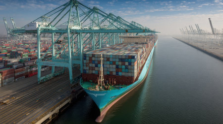 A large container ship is docked at a bustling port, surrounded by towering cranes and colorful cargo containers, showcasing maritime logistics and transportation.