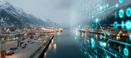 High-tech Industrial Port with Binary Code The Future of Global Cargo Transport and Logistics