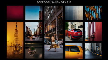 Framed visuals of diverse subjects are arranged on a sleek wall, creating a captivating gallery that combines modern design with artistic expression.