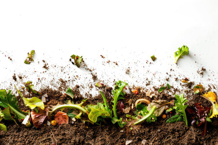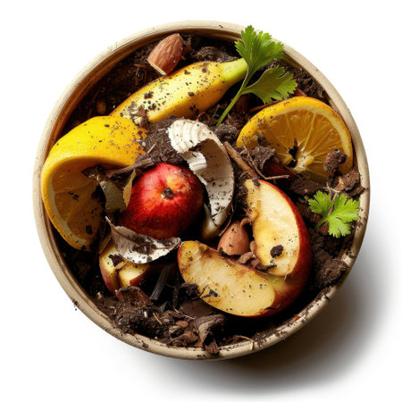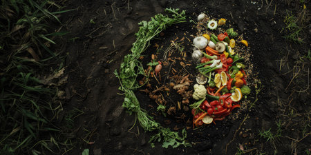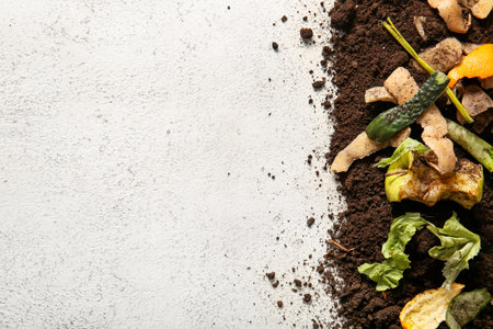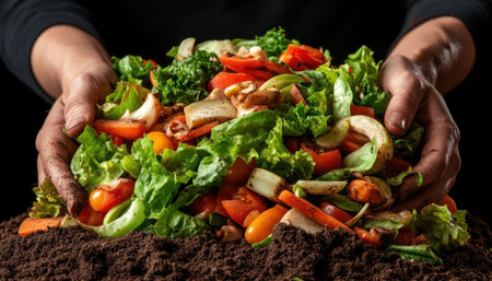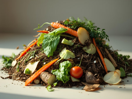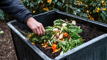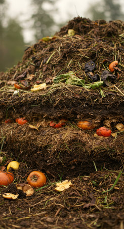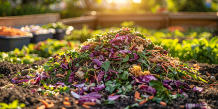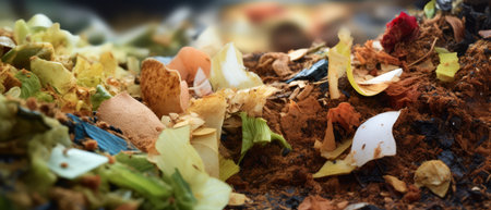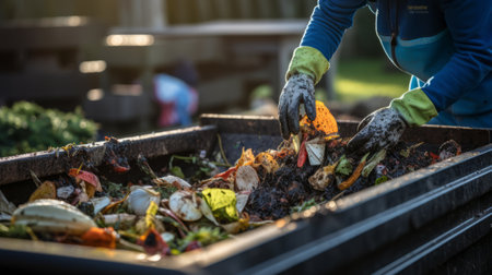 Close-up of composting process with food scraps and yard waste being mixed and decomposing into high-quality compost, showcasing effective waste management