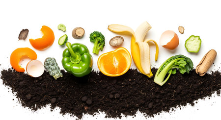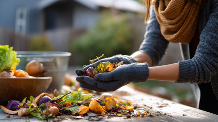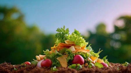 veggie and fruit scraps being composted for use in gardens, created with generative ai