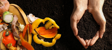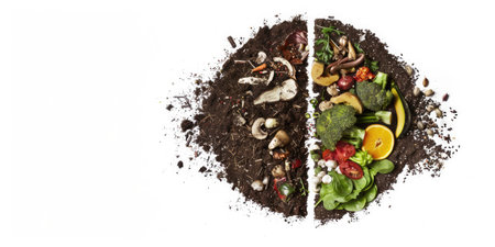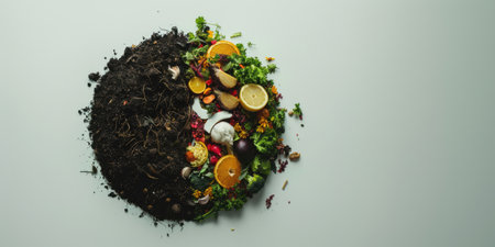 Generative AI, half of food waste compost and half of soil, environmental background, biodegradable kitchen waste, composting organic food