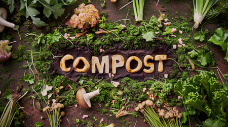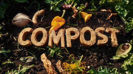 Generative AI, word Compost made of food waste compost and soil, environmental background, biodegradable kitchen waste, composting organic food