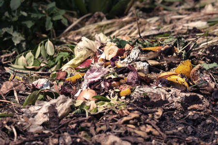 The close-up of a pile of humus in a garden with organic waste from vegetable and fruit bowls.