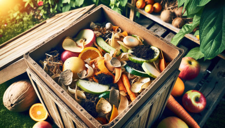 A compost bin filled with colorful food scraps and vegetable peels, promoting eco conscious living and sustainability