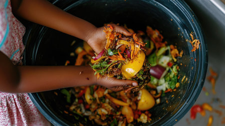 An engaging image suitable for environmental blogs, sustainable living guides, or educational material on waste management | The photograph showcases an individual's hands actively participating in the composting process, symbolizing human interaction with nature's recycling system. Captured with remarkable clarity, the mixture of organic waste—striking in its variety of colors and textures—is being poured from a bucket into a compost bin. The act caught in the frame, highlighted by the dynamic scattering of scraps and soil, conveys the tangible process of turning kitchen waste into nutrient-rich compost. The depth of the image juxtaposes the sharp foreground against the softer, verdant background of a garden, suggesting a continuous cycle from growth to decay and back to enrichment. It also subtly celebrates the personal effort and commitment to environmental stewardship while demonstrating the simple, yet effective method of reducing one's ecological footprint | Ideal for educational content stressing the importance of organic recycling and waste reduction, as an illustrative scene in a documentary about sustainable practices, or as a powerful visual reminder of individual responsibility towards the environment in campaigns promoting green habits. It may also serve as a compelling image for workshops or tutorials about starting a home composting system | a detailed photo of hands tipping biodegradable waste into a compost container amidst a garden environment, capturing a fluid motion and the contrasts in organic matter's color and texture under natural daylight