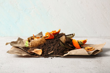 Various food scraps like eggshells, vegetable waste, and seeds piled on a gray surface, highlighting sustainable composting practices for a greener future.