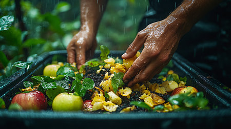 Person Composting Food Waste in a Rainy Forest Featuring Apples and Vegetables for Sustainable Gardening
