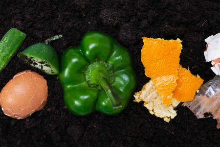 Various vegetable scraps were scattered on the soil. Gardening and planting concept.