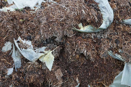 texture of brown dung with pieces of white plastic from a bag in a heap outside