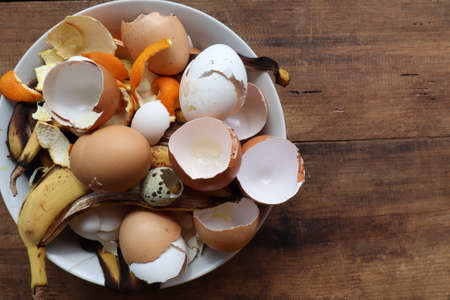Banana skin, eggshell, and orange peels in white bowl on wooden table background. Using kitchen scraps in compost or homemade fertilizer. Zero waste concept. Top view, copy space