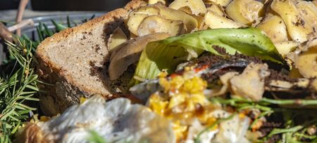 View into a bio container with various organic wastes such as potato and salad for recycling.