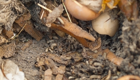 maggot grubs decomposing food and vegetable scraps in compost bin