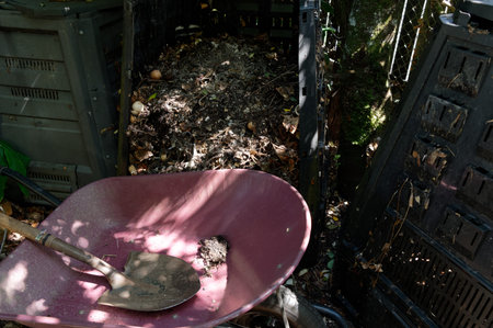 A wheelbarrow is waiting to be filled with compost from the compost bin. A shovel is there to be used for the job.