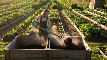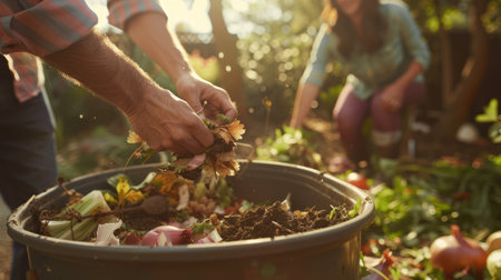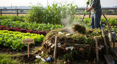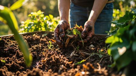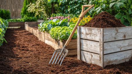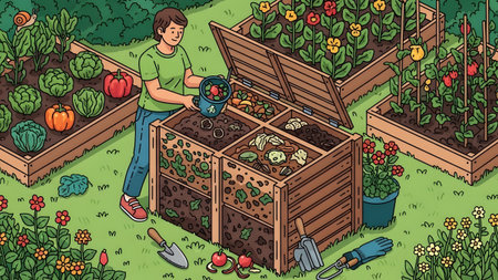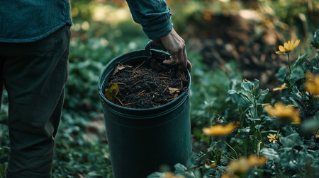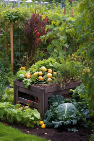 A person adds organic waste to a wooden compost bin in a lush garden filled with vegetables and...
