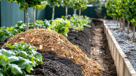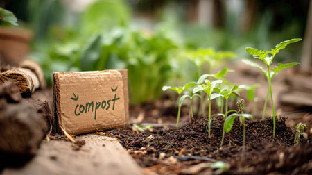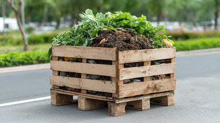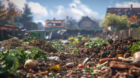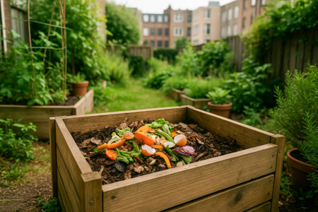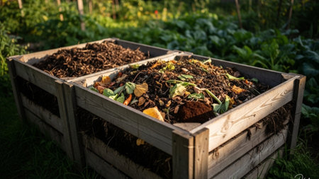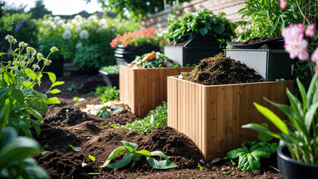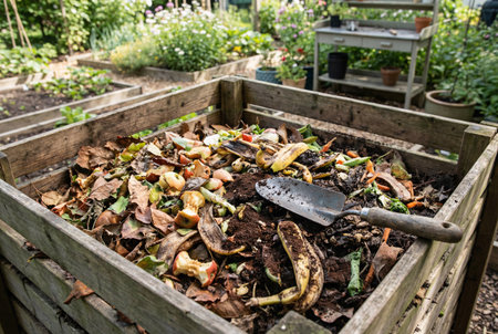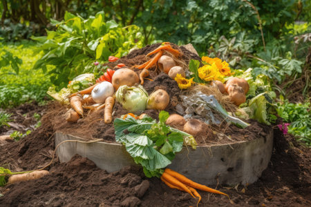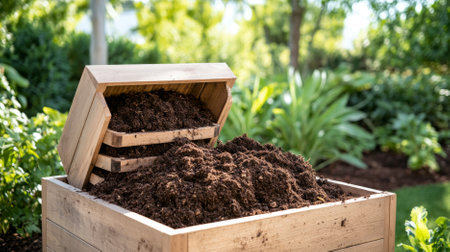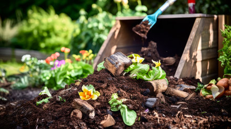compost bin with organic waste in a peaceful garden setting, created with generative ai
