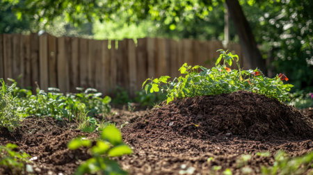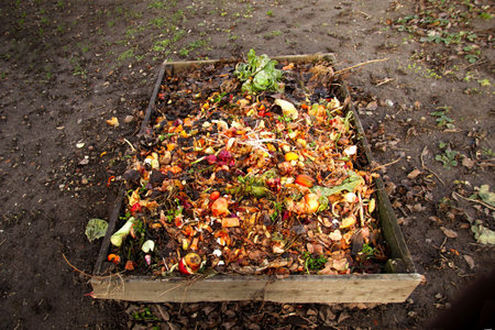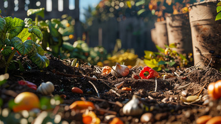 Compost pile, decomposing organic waste, biodegradable waste like vegetables, fruits, eggshell, coffee grounds