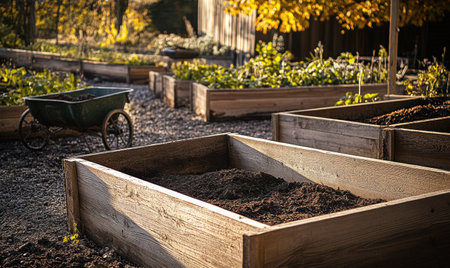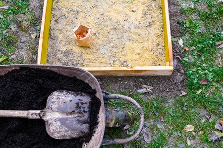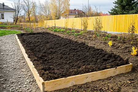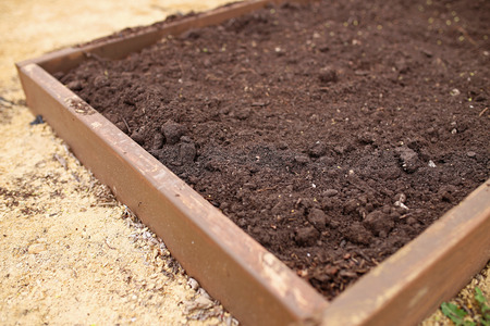 A freshly prepared empty raised garden bed is filled with rich soil on a spring day.