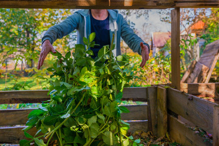 Composting and sustainable organic gardening. Female gardener putting green garden plant waste into an diy build garden compost bin. Recycling biowaste.