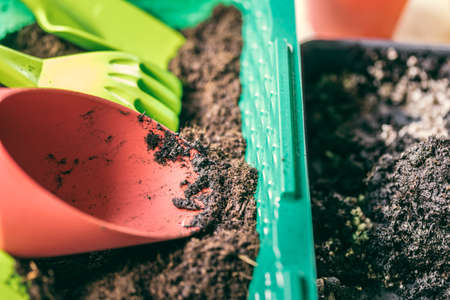 Gardening tools on soil. Horticulture and gardening concept. Spring in the garden. copyspace.
