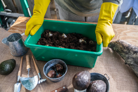 Gloved hands of a woman planting tulip bulbs in a pot with soil.
