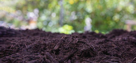 Soil texture blur background. Dark brown fertile dry dirt, Earth, fresh organic natural ground close up. Agriculture concept, farm and garden work template.
