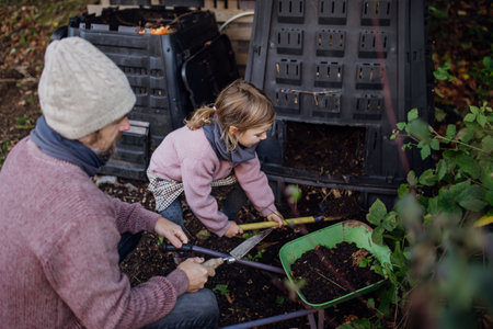Girl helping father to remove compost from a composter in garden. Concept of composting and sustainable organic gardening.