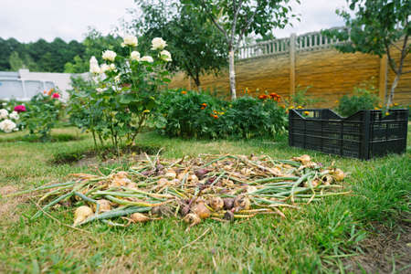 Freshly picked organic home grown onion vegetables are dried on green grass in a country cottage garden in Russia