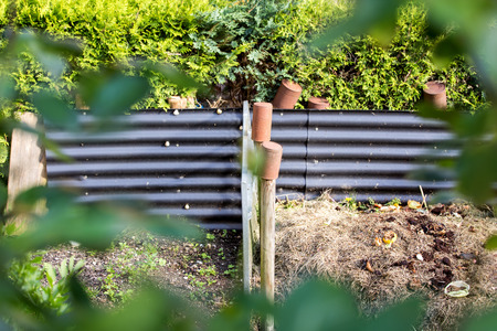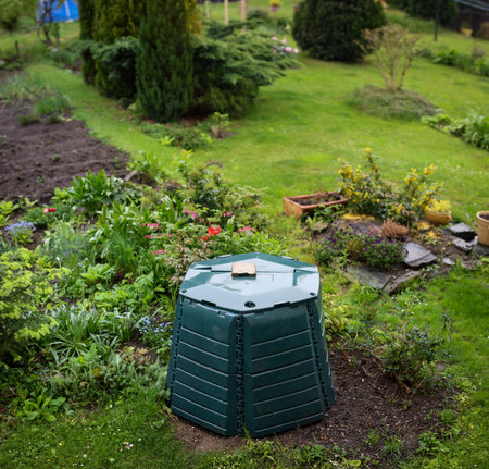 Outdoor composting bin for recycling kitchen and garden organic waste in a lovely lush garden