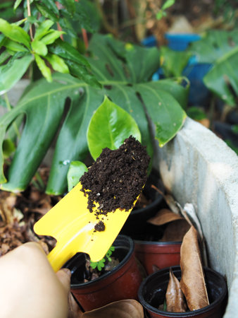 Farmer hand showing a soil after add a compost and manure at home garden.