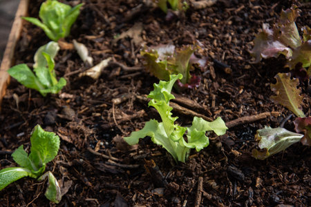 Overhead view of coffee grounds being added to baby vegetables plant as natural organic fertilizer rich in nitrogen for growth