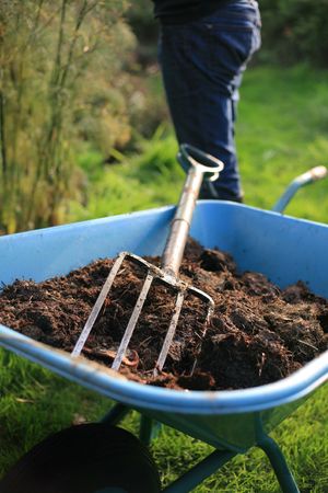 shovel and soil on wheelbarrow with backyard plants in the background shot at shallow depth of field