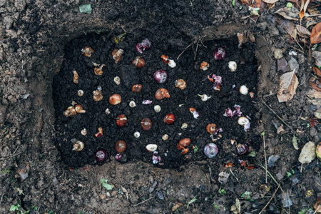 Planting tulip bulbs in a raised bed. Adding compost to flowerbed. Growing tulips. Fall gardening jobs background.
