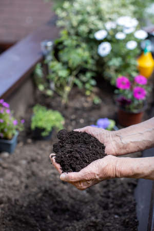 elderly woman in small terrace garden holding soil in her hands while planting flowers