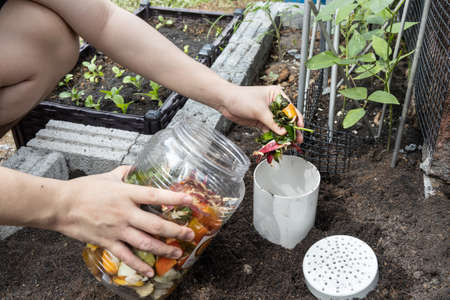 Person filling the worm tower with kitchen organic waste. Worm activity turns material into compost to enrich soil