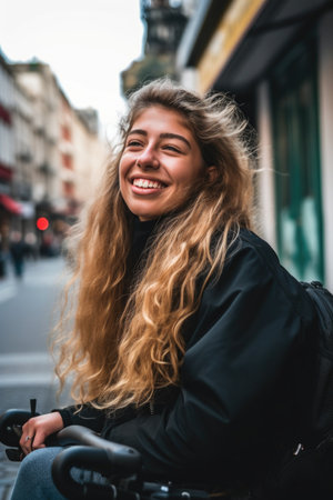 portrait of a young woman traveling in her wheelchair, created with generative ai