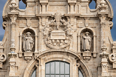 Santiago de Compostela cathedral facade detail with two sculptures of Saint James and the tomb. Baroque facade detail. Ancient architecture