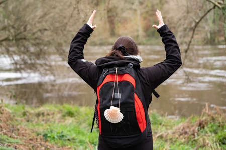 Pilgrim brunette woman, with ponytail, a black and red backpack with a hanging shell, doing the Camino de Santiago, looking towards a river and throwing her hands to her head