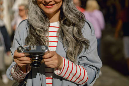 A woman in a hat visiting the city and taking photos with a vintage camera, enjoying summer vacations, concept of female traveler and digital content creator