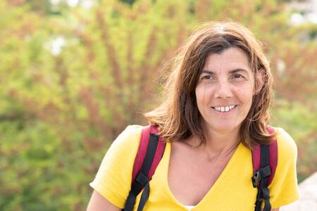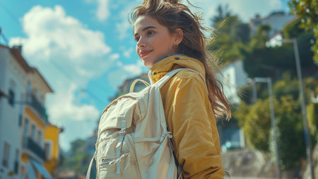 Young woman in a yellow jacket with a backpack walks along the city street.