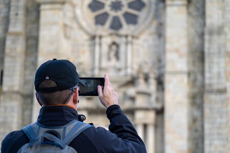 Porto, Portugal - January 20, 2020: Adult male tourist photographs the Porto Se Cathedral Church with an iPhone smartphone camera