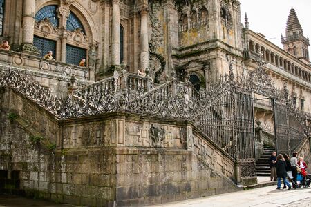 Santiago de Compostela, Galicia, Spain; 02-28-2008: Facade of the door of the obradoiro and entrance to the cathedral of Santiago and the bars with the cross of Santiago