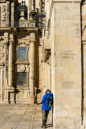 Pilgrim resting on the way before the Cathedral of Santiago de Compostela, in Galicia, Spain