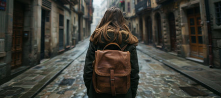 Young female backpacker exploring old town streets in spain on solo travel adventure