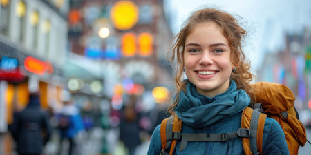 A cheerful young person with curly hair enjoys the bustling city atmosphere.