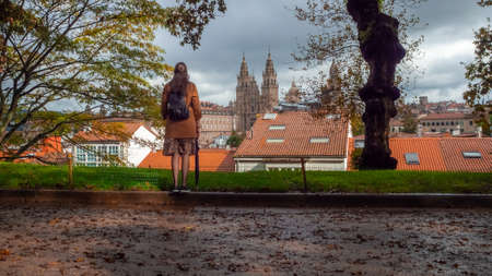 Pilgrim brunette woman, doing the Camino de Santiago, looking at a cathedral, with a blue backpack and a shell, with a black jacket. Lifestyle concept. Hike, way of st james