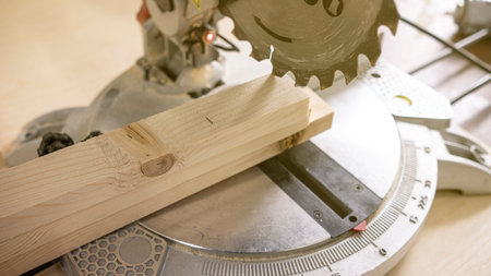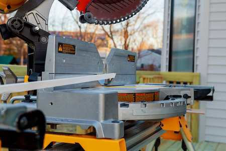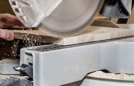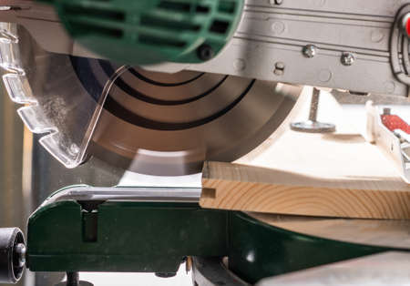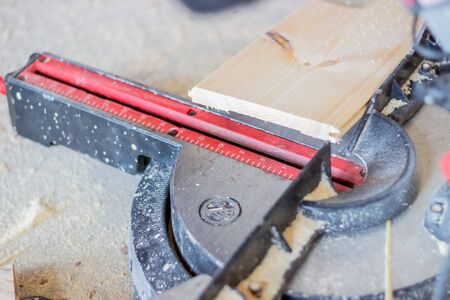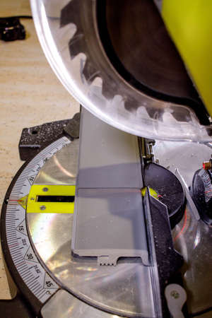 Compound miter saw. Wood and sawing machine construction ideas concept