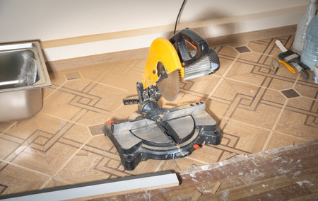 The circular saw cuts the plinth. Tool for repair work