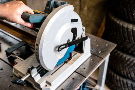 metal saw with tool cutting disc makes a cut