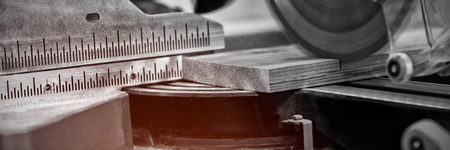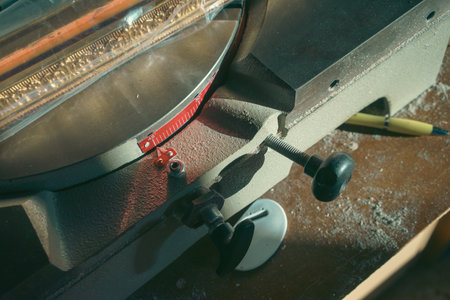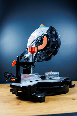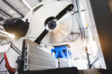 industrial tool in wood and metal factory, compound mitre saw with sharp, circular blade